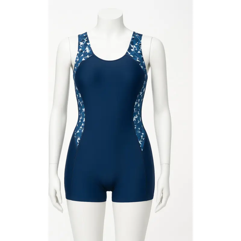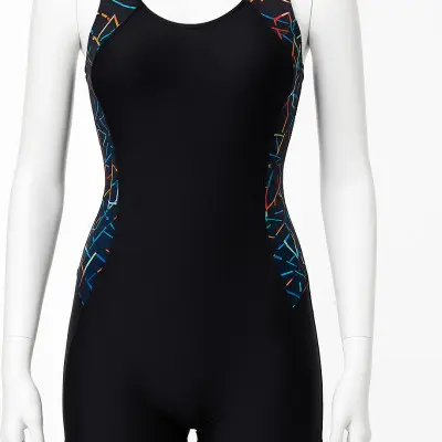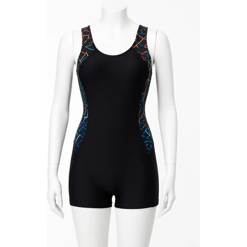 Estilo, conforto e liberdade de movimento. Este fato de banho foi pensado para mulheres ativas que não abdicam de um toque de cor. O corte tipo calção oferece cobertura extra e segurança, enquanto os painéis laterais com padrão geométrico multicolorido criam um efeito visual adelgaçante e moderno.